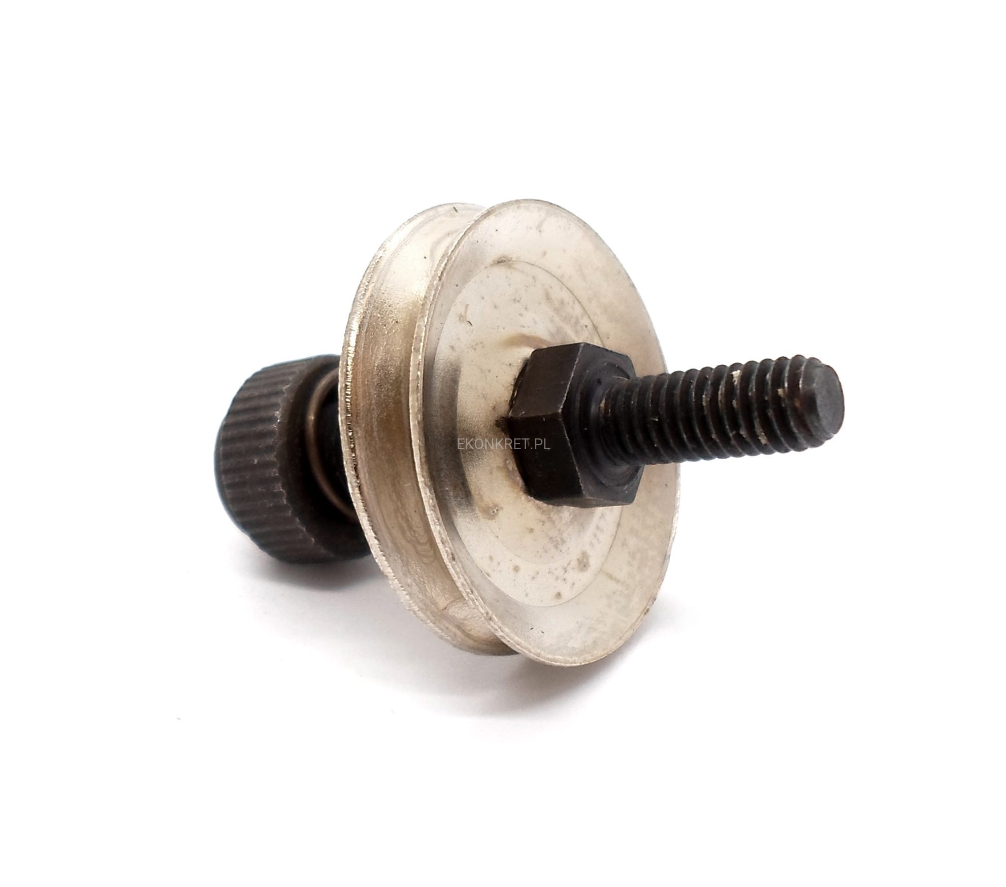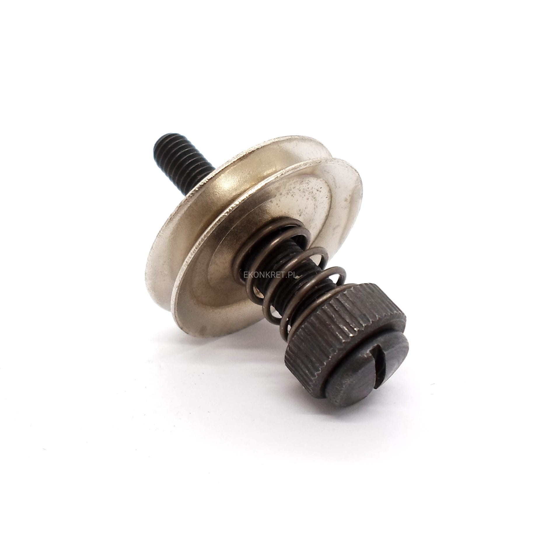 Kompletny naprężacz do zaszywarki GK 26, zawierający śrubę trzonową, talerzyki, sprężynę oraz nakrętkę.