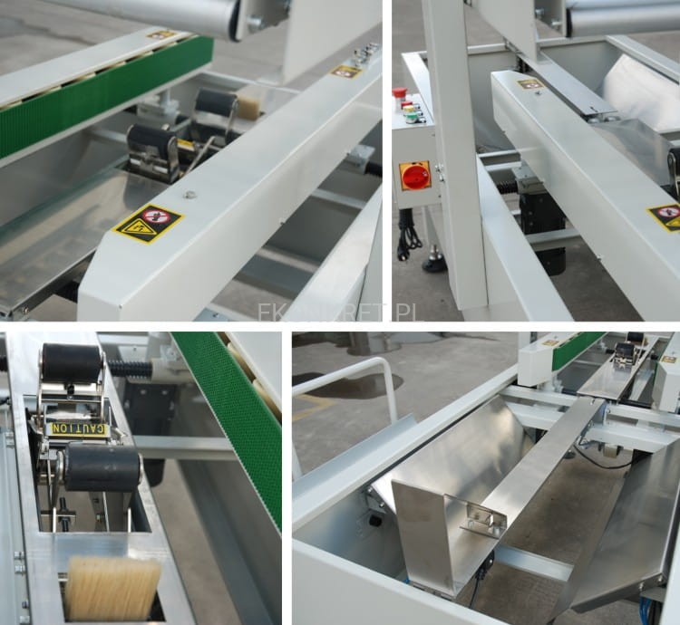 Model DZF-5050 jest ręcznie regulowaną zaklejarką do kartonów z bocznymi pasami napędowymi oraz dolnym zaklejaniem. Ponadto zaklejarka posiada pneumatyczne składanie dolnych, dłuższych klap kartonu w miejscu stołu roboczego, w którym załadowuje się karton.