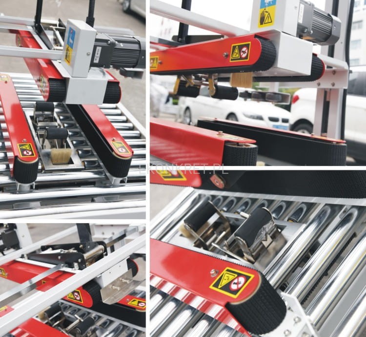 Półautomatyczna Zaklejarka Kartonów FXJ 8070B Przeznaczona do zaklejania ciężkich kartonów taśmą od góry i dołu jednocześnie. Posiada płynną regulację wysokości i szerokości oraz górny i boczny transport.