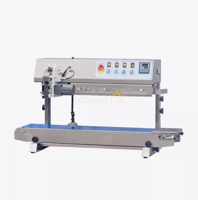 Zgrzewarko – drukarka stałocieplna do zgrzewania ciągłego z taśmociągiem w pozycji pionowej. Urządzenia te, w odróżnieniu do zwykłych zgrzewarek, mogą obsługiwać kilka woreczków naraz, umożliwiają więc one maksymalne przyspieszenie procesu pakowania oraz znakowania Państwa produktów. Maszyna wykonuje zgrzew o szerokości 10 mm za pomocą dwóch listew stałocieplnych. Dodatkowym atutem urządzenia jest praktycznie nieograniczona szerokości woreczka. Bardzo ważne jest również to, iż sterowanie wszystkimi funkcjami maszyny skupione jest na jednym, centralnym panelu sterowniczym, znajdującym się z przodu urządzenia.