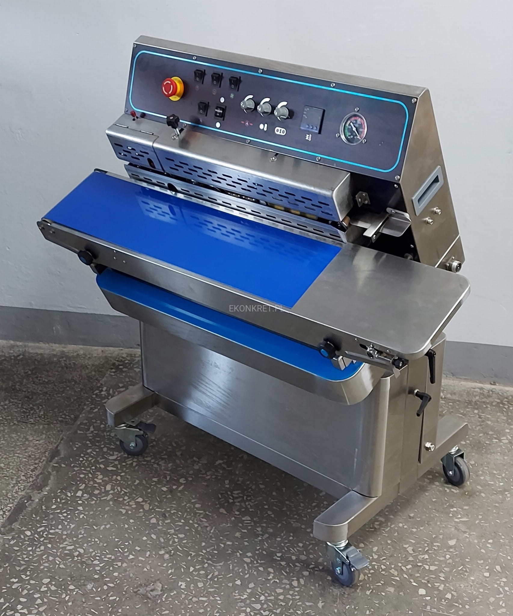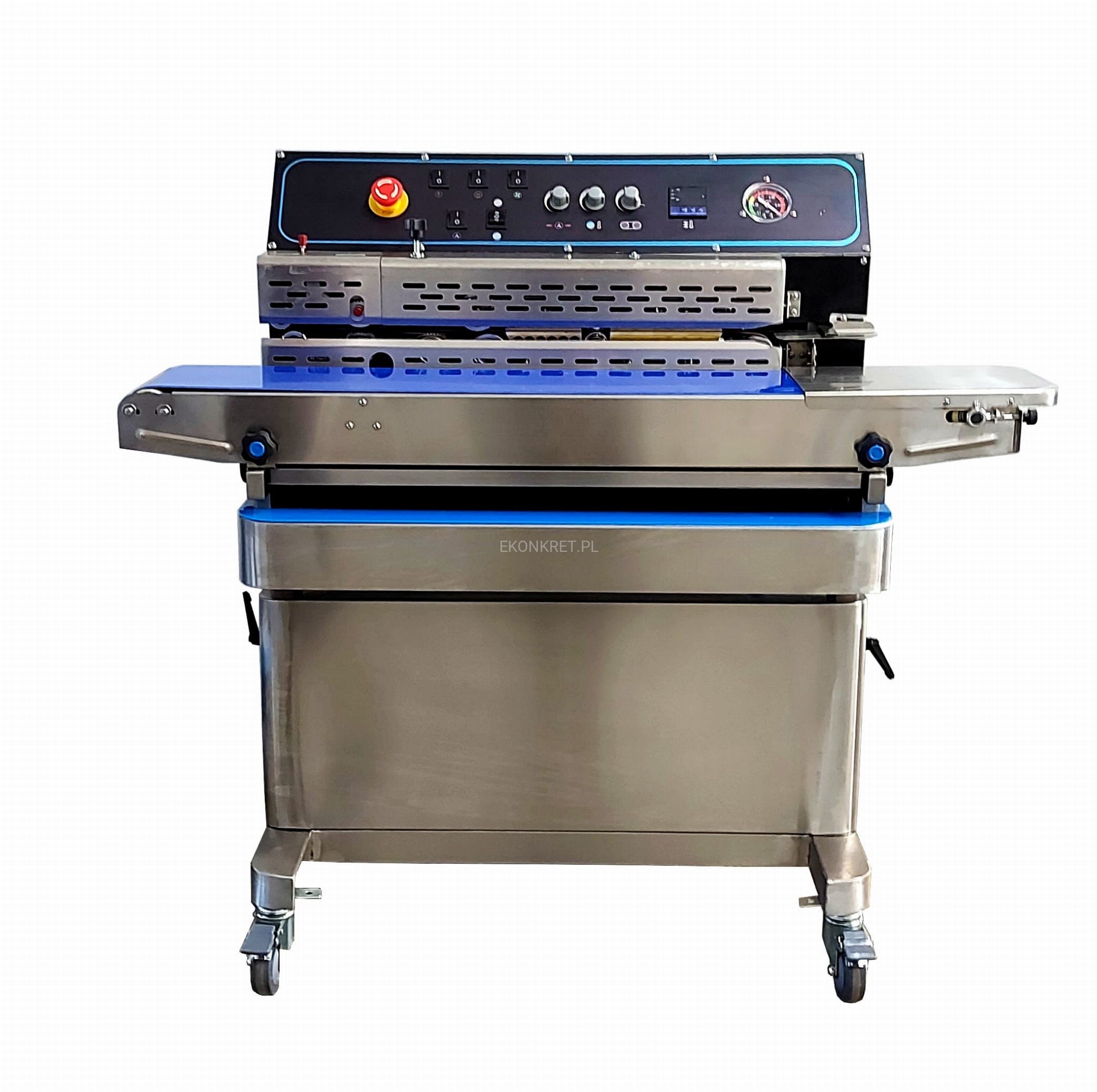 Ponadto zgrzewarka posiada regulowaną wysokość oraz kąt głowicy zgrzewającej, a także numerator, pozwalający na naniesienie na zgrzewie daty ważności lub numeru partii. W zestawie dołączony jest włącznik nożny którym obsługujemy pracę pompy próżniowej.